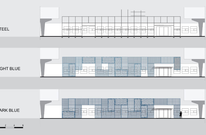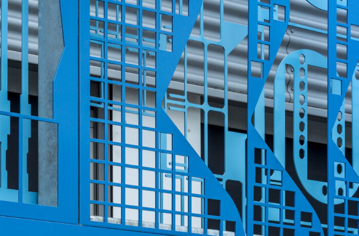 Het meest in het oog springende element is de nieuwe gevel. bureau SLA ontwierp deze gevel met reststaal uit de auto-industrie, op basis van de Oogstkaart van Superuse Studios. De gevel bestaat uit twee lagen zogeheten contourplaten. Autofabrikanten snijden uit deze platen onderdelen voor nieuwe auto’s. Wat overblijft is een stalen plaat van 6 mm dik met een uitgesproken grafisch patroon.
