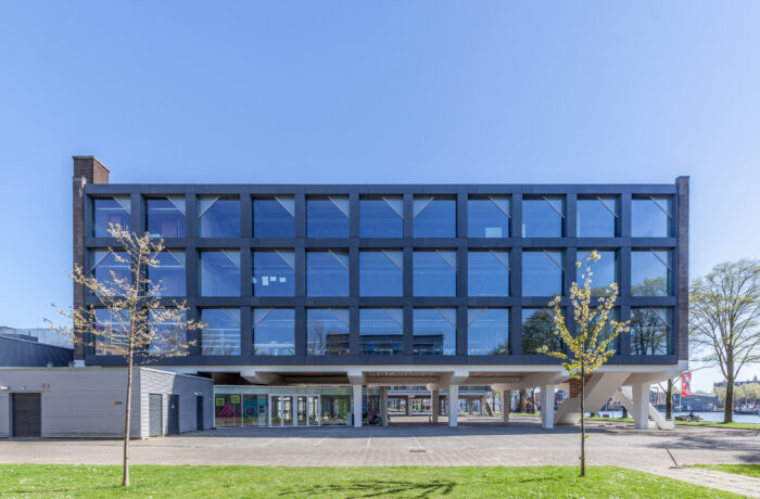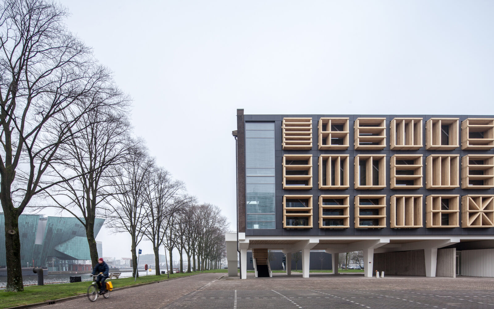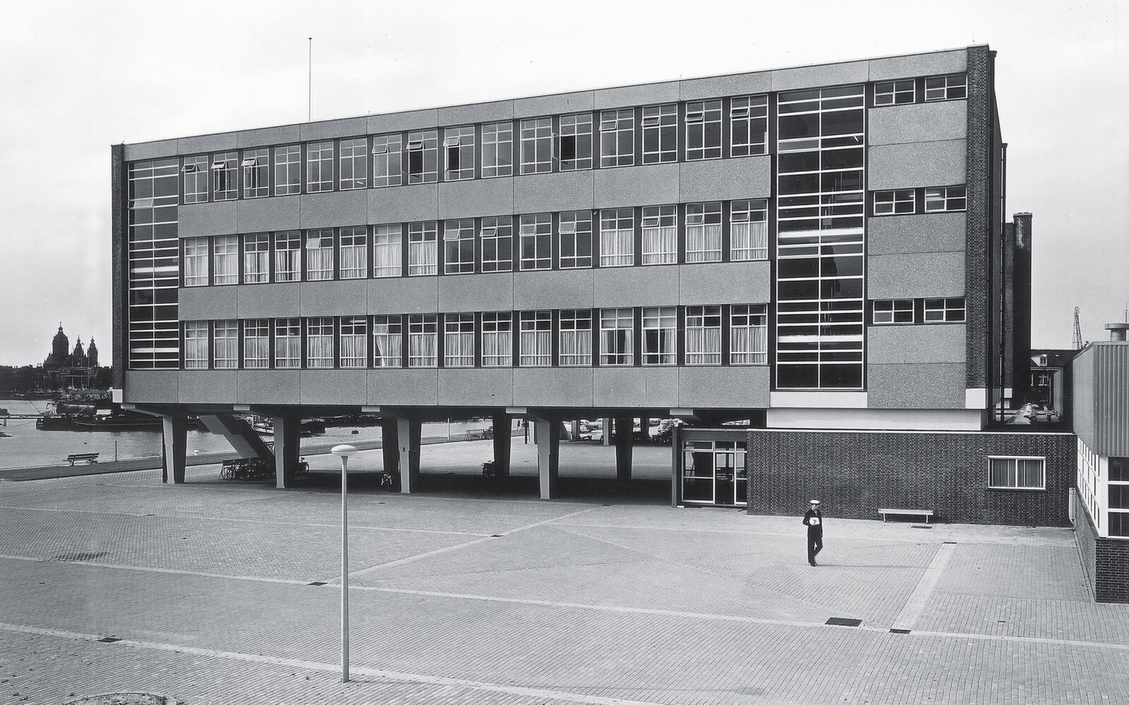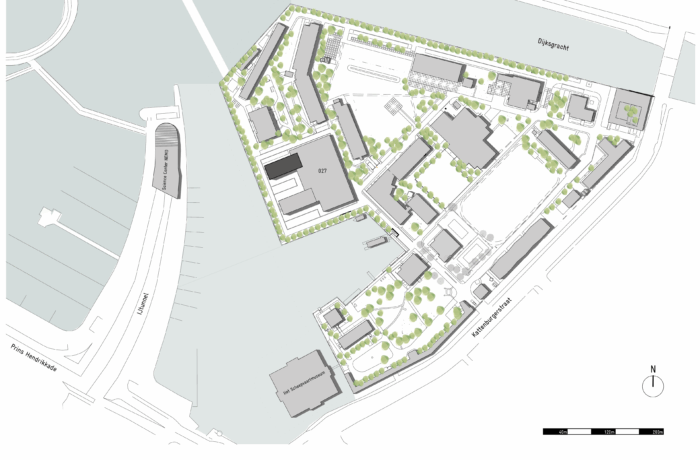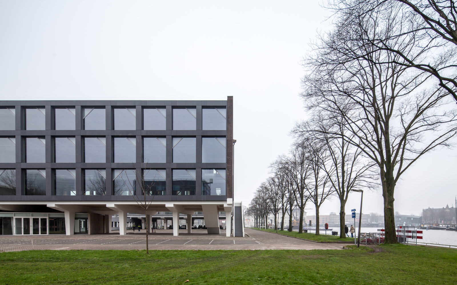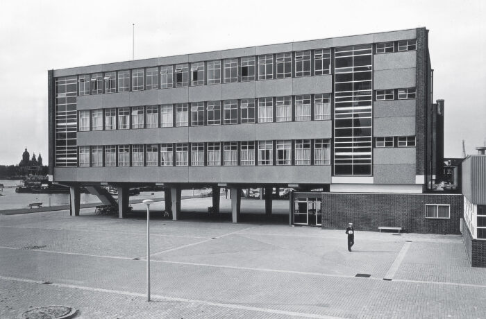 Het betonnen casco staat aan het water, naast het Scheepvaartmuseum en het Science Center Nemo in het hart van de stad. Het maakt deel uit van een ensemble van twee ooit identieke gebouwen, verbonden door laagbouw. Het gebouw heeft gediend voor technisch onderwijs aan militairen. Geheel volgens de “Vijf Punten van een Nieuwe Architectuur” van Le Corbusier zijn de beide onderwijsgebouwen uit 1962 van de grond verheven. De kolommen waar het gebouw op rust (‘pilotis’) waren in die periode dankbare elementen voor sculpturale expressie. De rest van het gebouw bestaat uit een grid van kolommen, vloerbalken en vloeren met gemetselde kopgevels. Een betonnen noodtrap keert zich naar het water. Alle beton is in het werk gestort: de planken van de bekistingen zijn nog mooi leesbaar in het zichtbare beton. De toegang bevindt zich onder de kolos in een subtiel ingebedde entreepartij. Het ontwerp van bureau SLA bestaat uit een nieuwe indeling, nieuwe voorzieningen en nieuwe gevels. Elke verdieping heeft een netto vloeroppervlak van 500 m2. Het gebouw kan gebruikt worden als werkruimte, maar faciliteert ook bijeenkomsten met een groot aantal mensen. Om dit mogelijk te maken zijn een aantal veranderingen doorgevoerd, waarvan de grote lobby, ruime toiletten, lift, extra noodtrappen en vaste zonneschermen de meest in het oog springende zijn.
