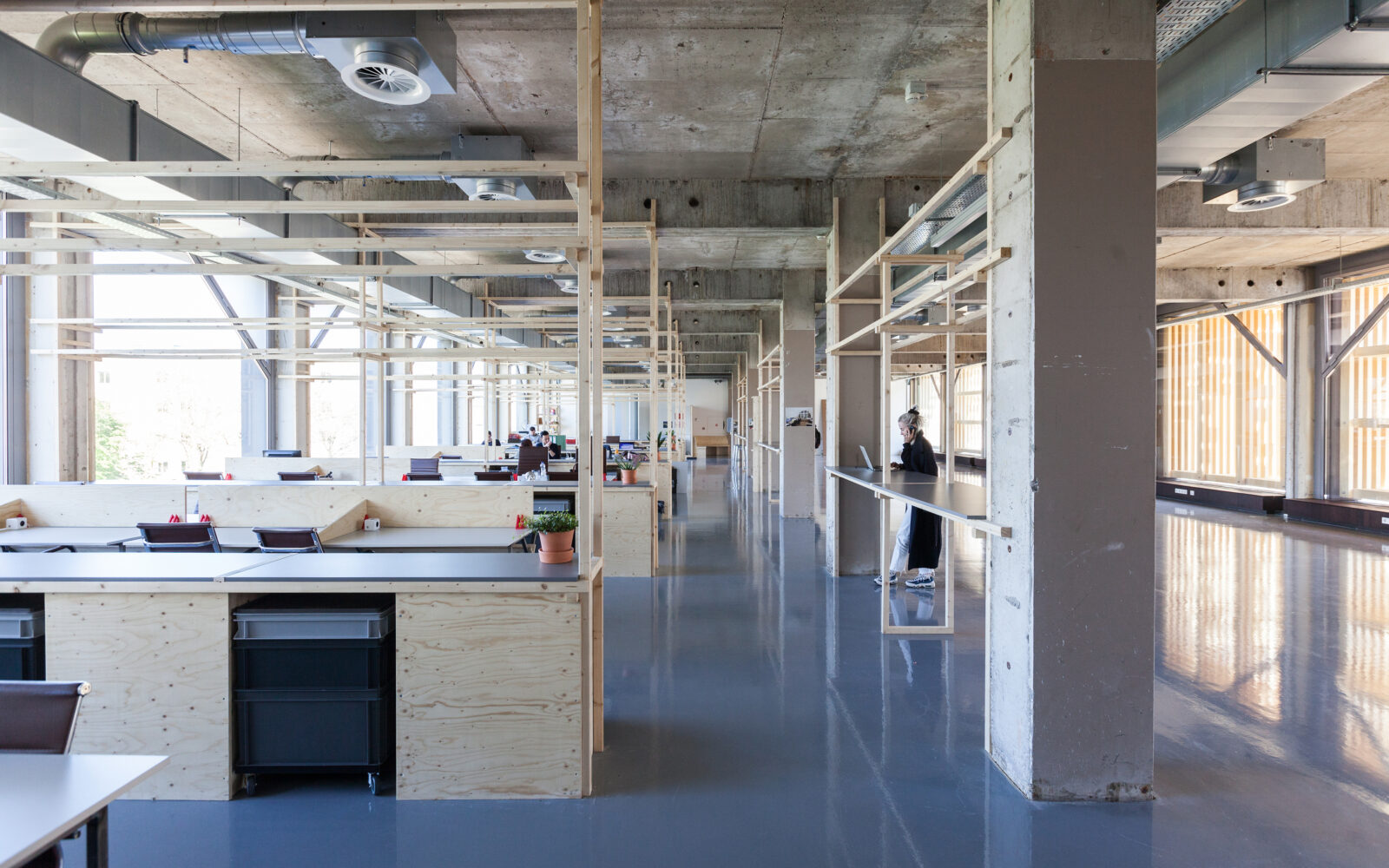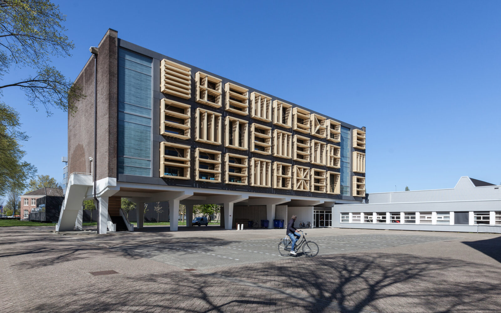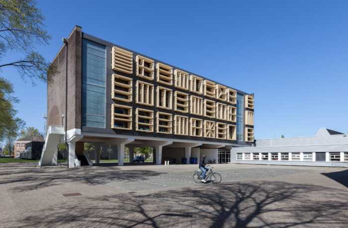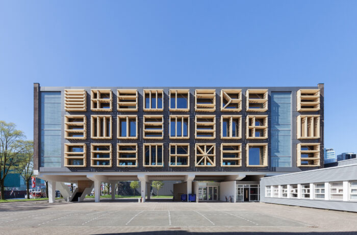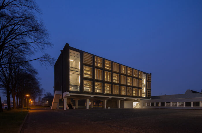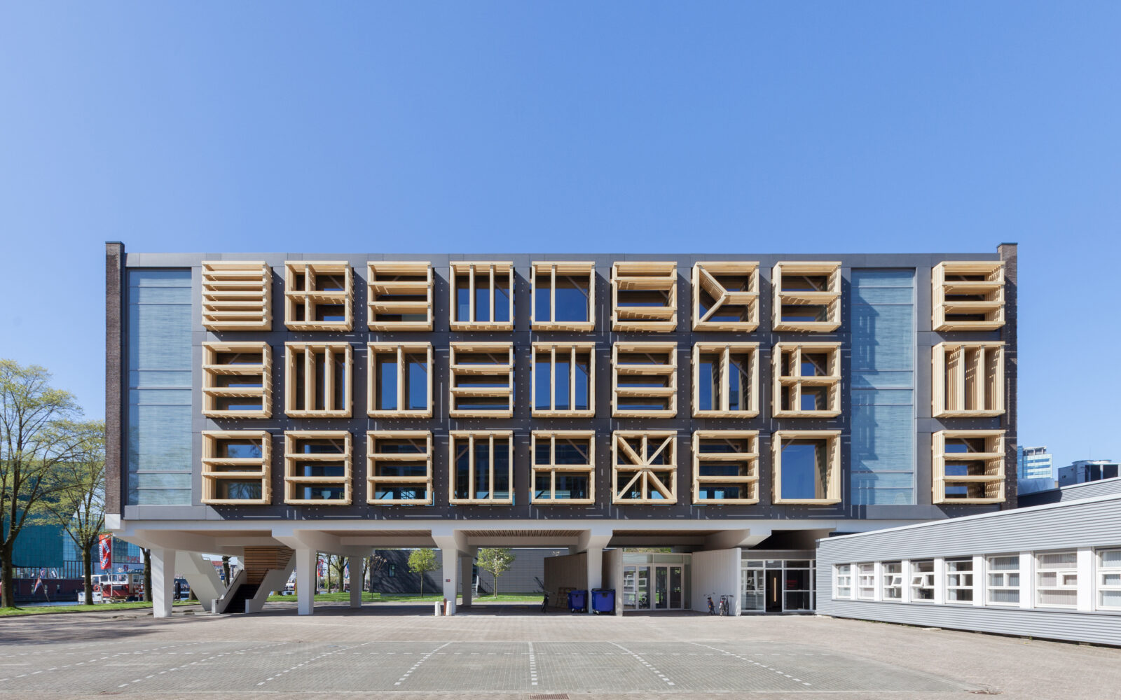 Het betonnen casco staat aan het water, naast het Scheepvaartmuseum en het Science Center Nemo in het hart van de stad. Het maakt deel uit van een ensemble van twee ooit identieke gebouwen, verbonden door laagbouw. Het gebouw heeft gediend voor technisch onderwijs aan militairen. Geheel volgens de “Vijf Punten van een Nieuwe Architectuur” van Le Corbusier zijn de beide onderwijsgebouwen uit 1962 van de grond verheven. De kolommen waar het gebouw op rust (‘pilotis’) waren in die periode dankbare elementen voor sculpturale expressie. De rest van het gebouw bestaat uit een grid van kolommen, vloerbalken en vloeren met gemetselde kopgevels. Een betonnen noodtrap keert zich naar het water. Alle beton is in het werk gestort: de planken van de bekistingen zijn nog mooi leesbaar in het zichtbare beton. De toegang bevindt zich onder de kolos in een subtiel ingebedde entreepartij. Het ontwerp van bureau SLA bestaat uit een nieuwe indeling, nieuwe voorzieningen en nieuwe gevels. Elke verdieping heeft een netto vloeroppervlak van 500 m2. Het gebouw kan gebruikt worden als werkruimte, maar faciliteert ook bijeenkomsten met een groot aantal mensen. Om dit mogelijk te maken zijn een aantal veranderingen doorgevoerd, waarvan de grote lobby, ruime toiletten, lift, extra noodtrappen en vaste zonneschermen de meest in het oog springende zijn.