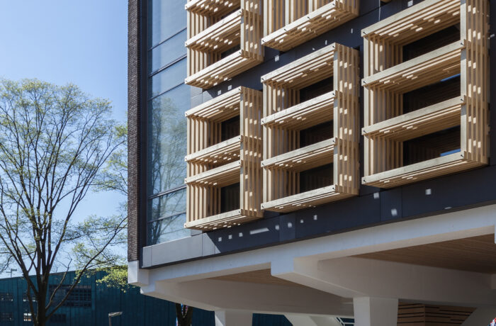 “Aan de zuidzijde voorzag Van Assche de glasvlakken van vaste zonwering , die is uitgevoerd in hout. Voor de opvallende vorm daarvan liet hij zich inspireren door de vlaggen van de Europese landen die er zouden vergaderen.”