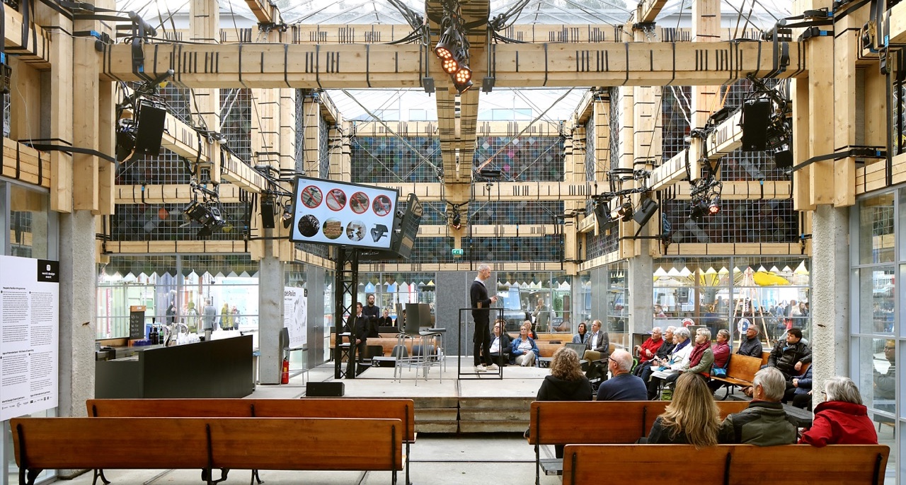 Het People’s Pavilion is de centrale ontmoetingsplek voor creatieve denkers en doeners uit de hele wereld. Het paviljoen is een 100% circulair gebouw: bij de bouw gaan geen grondstoffen van onze aarde verloren. De ontwerpers van bureau SLA en Overtreders W hebben hier een geheel nieuwe invulling aan gegeven: alle materialen die nodig zijn voor het maken van het 250 m2 grote gebouw zijn geleend. Van leveranciers en producenten, maar ook van bewoners uit Eindhoven.