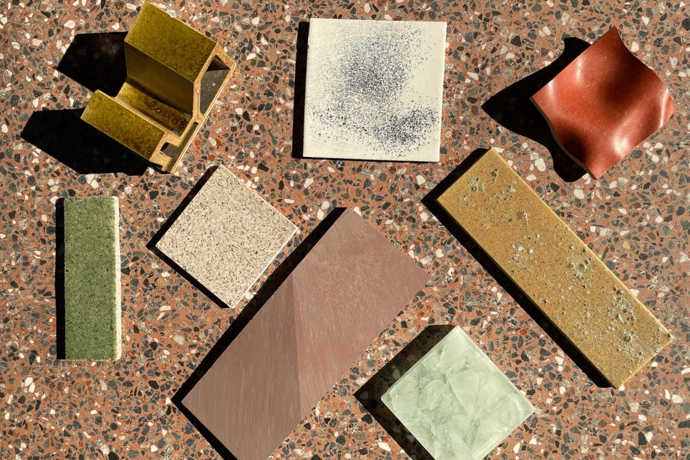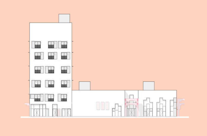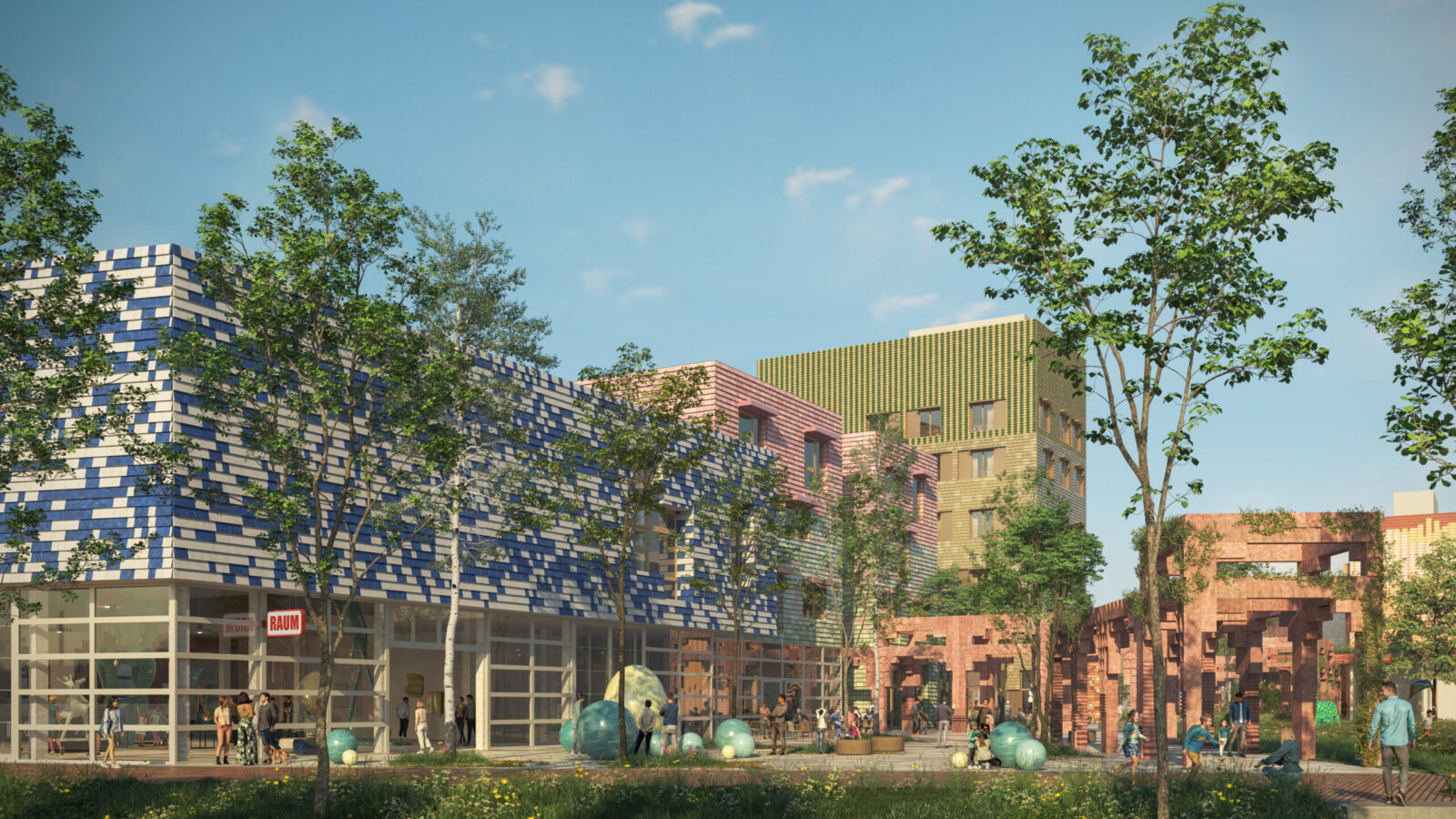 At the heart of the design is a load-bearing framework of red-tinted urban mining precast concrete. This robust structure spans the square, creates coherence, gives the complex a clear identity and marks the entrances. The six buildings stand on, within and alongside this framework. Their façades distinguish themselves from the rest of Leidsche Rijn through the expressive use of high-quality circular materials, including Waste Glaze, Pretty Plastic, Nabasco and tiles made from recycled glass. Because these materials share the same dimensions, the design swaps and recombines them to create a wide range of patterns and compositions. All ground floors are highly transparent: at RAUM you can walk straight in, while at NUT the inside of the theatre hall is visible directly from the square.