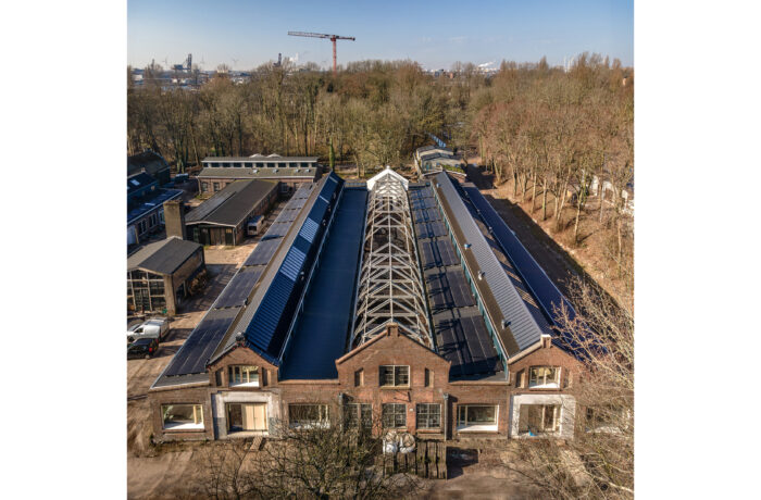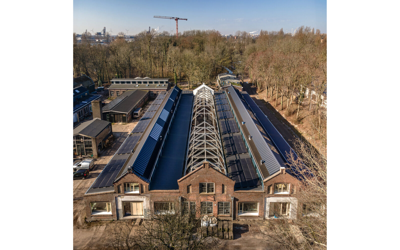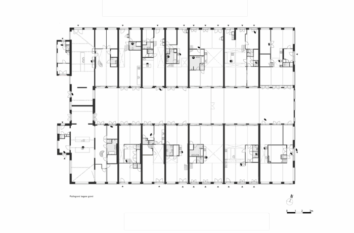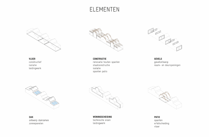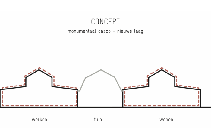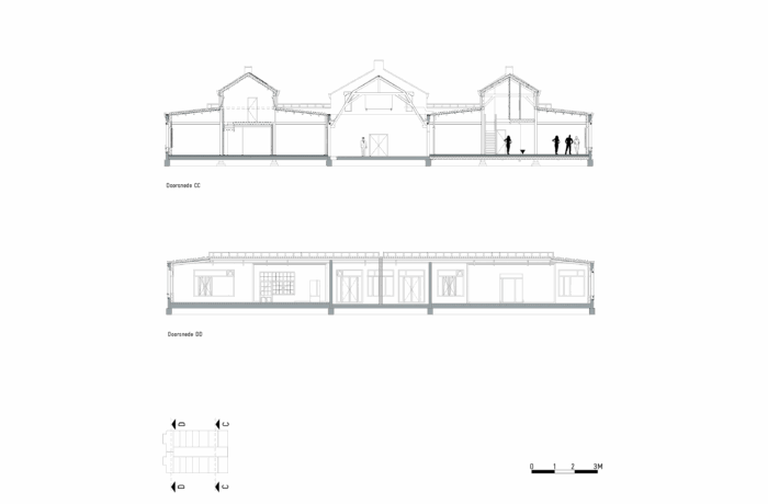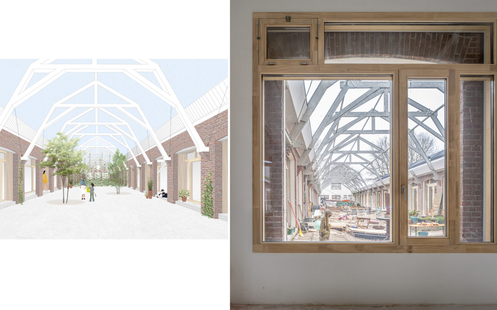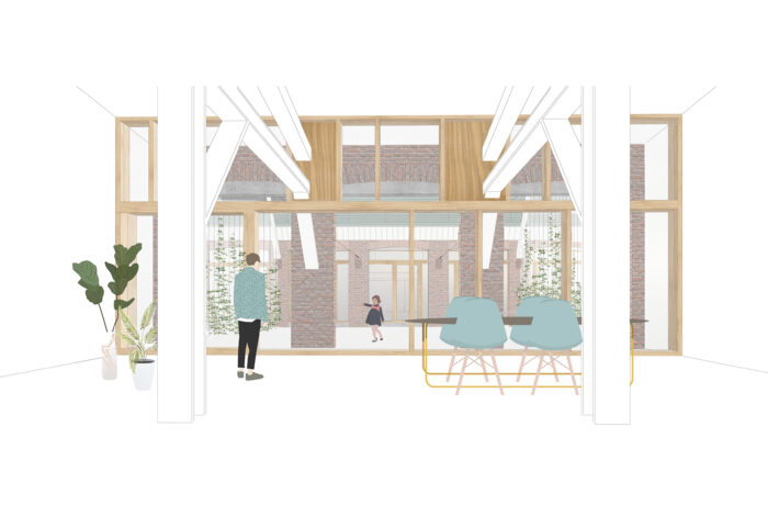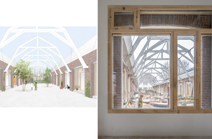 Certain elements, like the window frames, had to be replaced, but even in these cases, the replacements are designed to possess their own aesthetic, strength, and modernity. This showcases a new, distinguishable layer with its own identity, while remaining subservient to the building as a whole. Not immediately apparent from the exterior, is the fact that the building originally consisted of three separate workshops. It isn’t readily visible that behind one façade, there were several distinct spaces, which will soon be converted into eight living and working areas. The open space will feature new bio-based interior structures, with an eye for acoustics and details. The new interior walls are designed to maintain the symmetry and rhythm of the building’s openings, ensuring the original structure to remain discernible. The central hall will be transformed into an open patio, preserving the original framework. This collective central outdoor space will both separate and connect the living area in one side building with the work area on the opposite side.