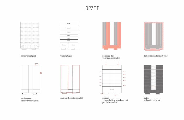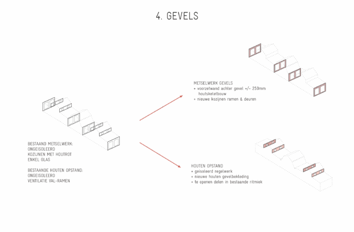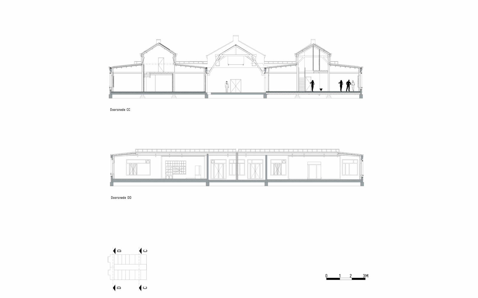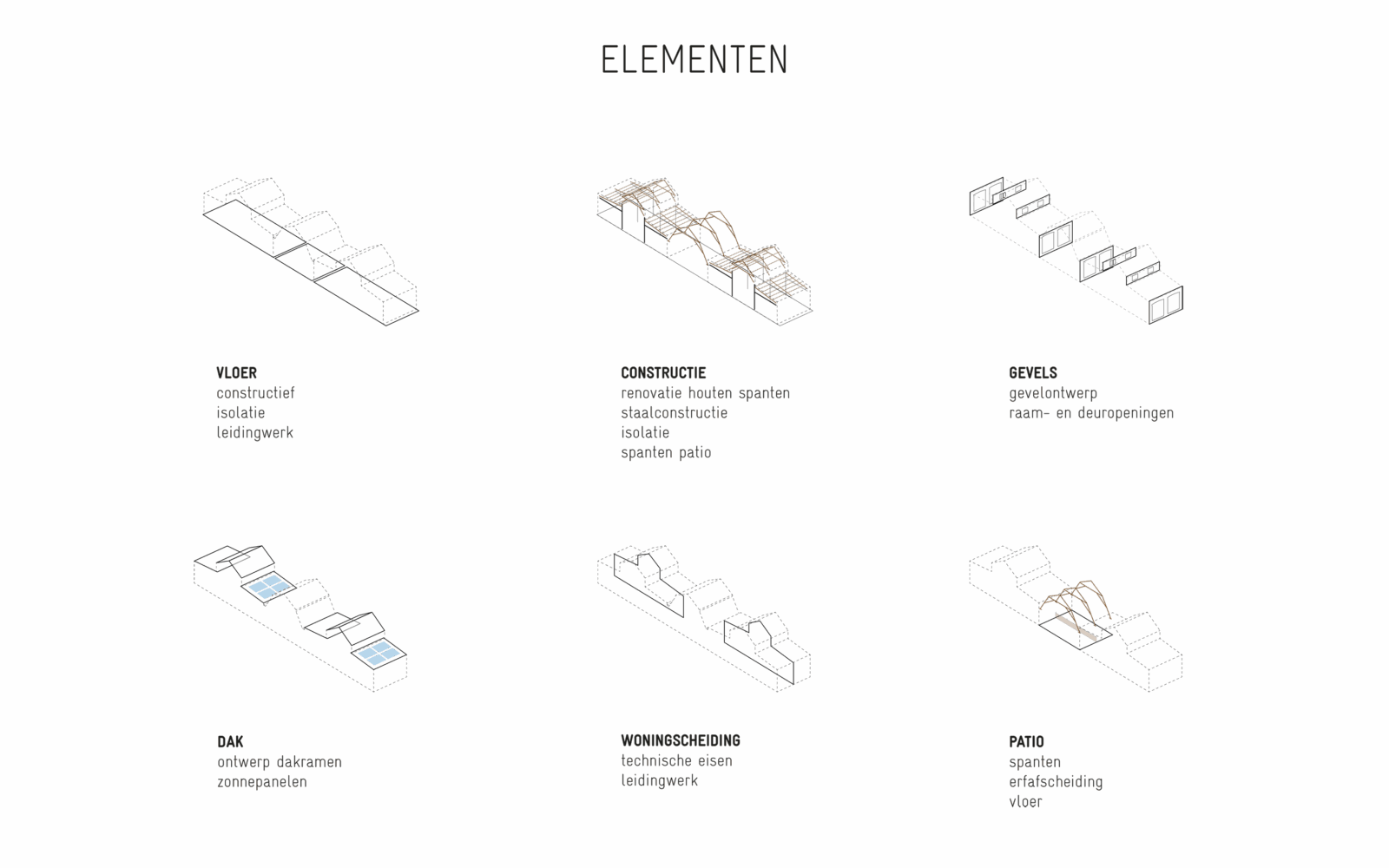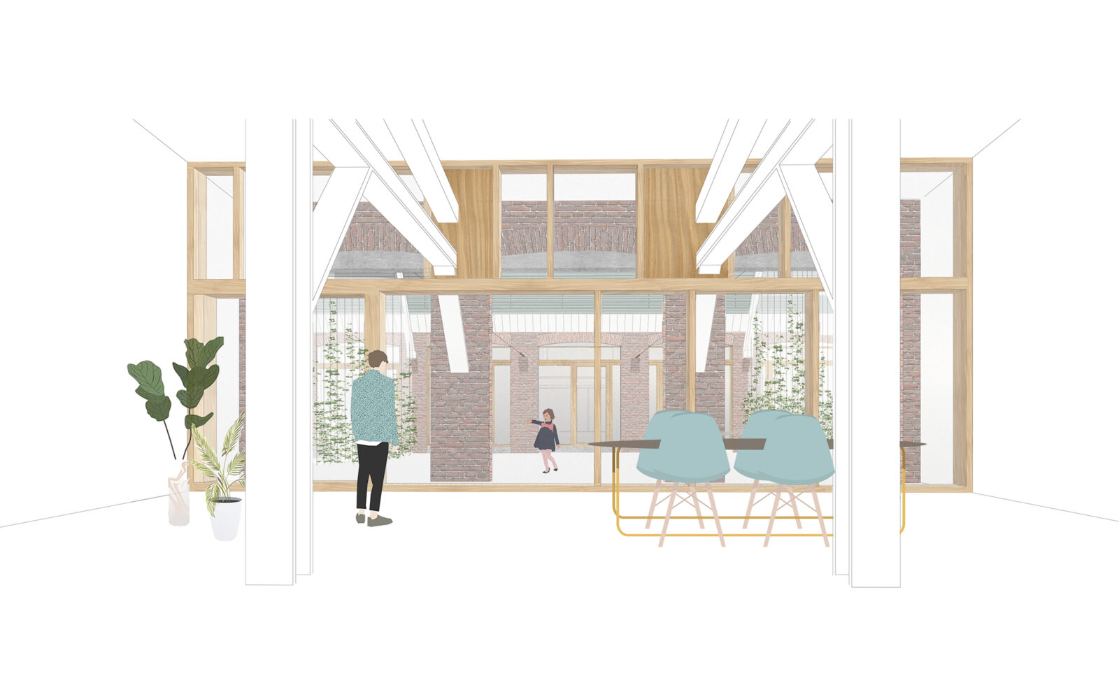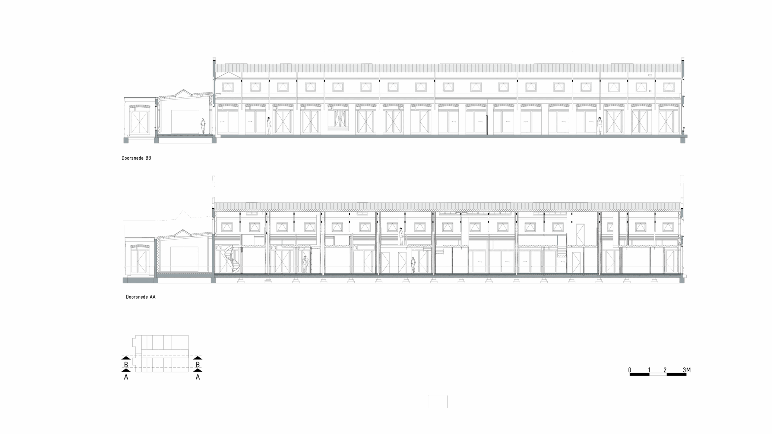 Certain elements, like the window frames, had to be replaced, but even in these cases, the replacements are designed to possess their own aesthetic, strength, and modernity. This showcases a new, distinguishable layer with its own identity, while remaining subservient to the building as a whole. Not immediately apparent from the exterior, is the fact that the building originally consisted of three separate workshops. It isn’t readily visible that behind one façade, there were several distinct spaces, which will soon be converted into eight living and working areas. The open space will feature new bio-based interior structures, with an eye for acoustics and details. The new interior walls are designed to maintain the symmetry and rhythm of the building’s openings, ensuring the original structure to remain discernible. The central hall will be transformed into an open patio, preserving the original framework. This collective central outdoor space will both separate and connect the living area in one side building with the work area on the opposite side.