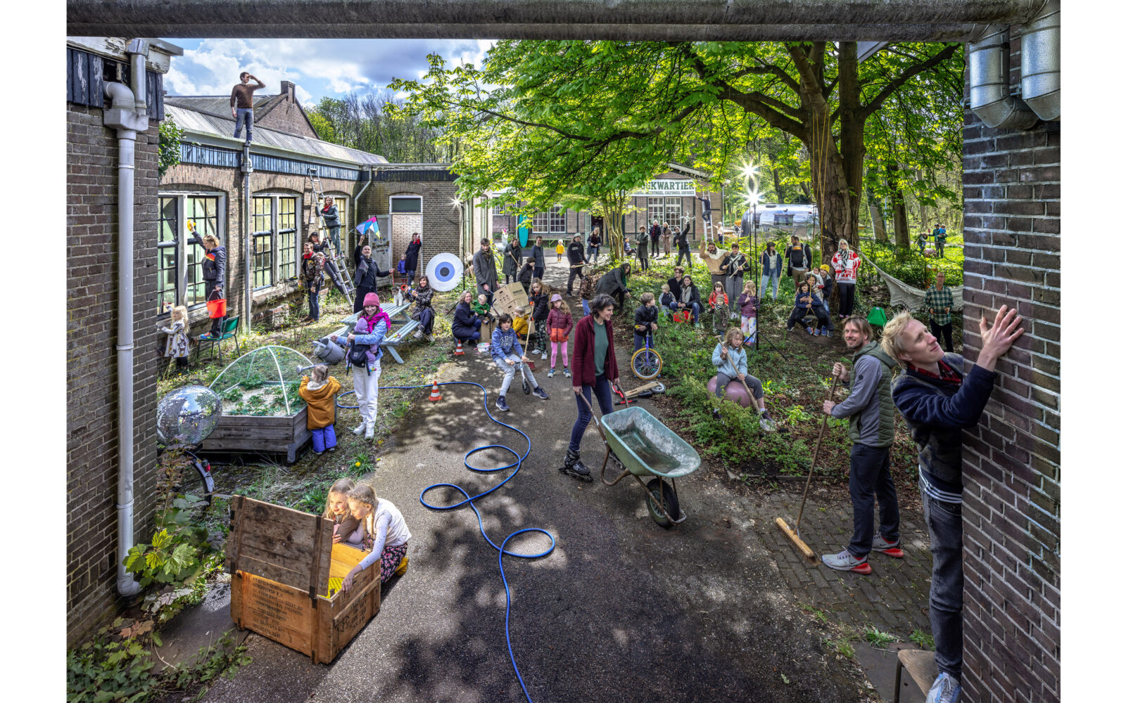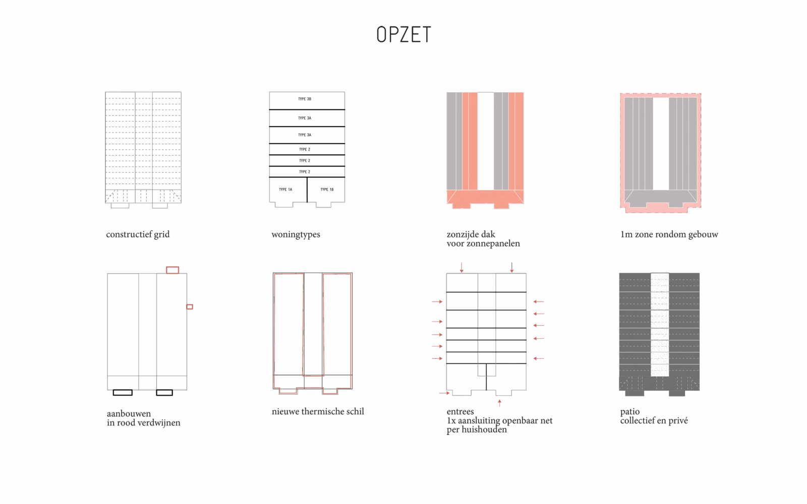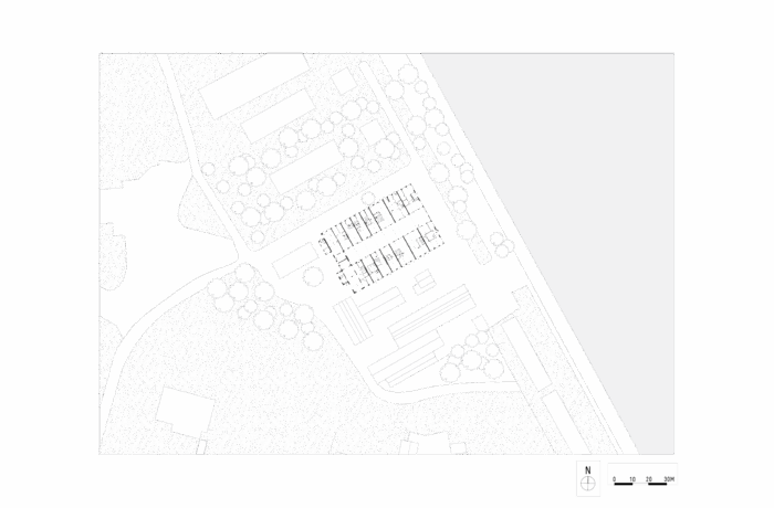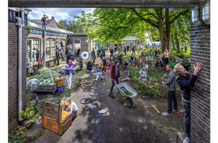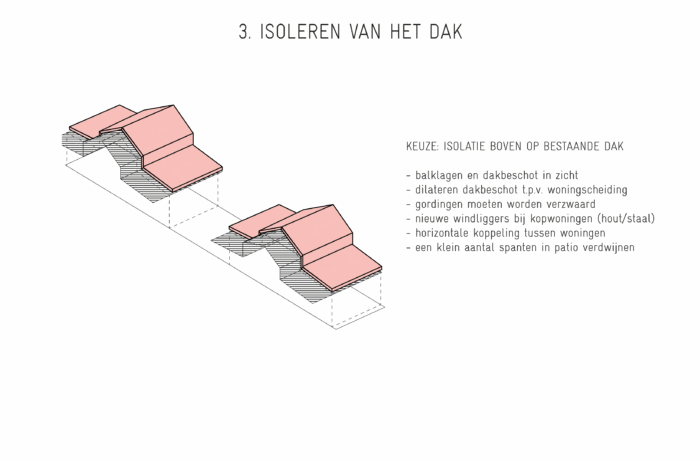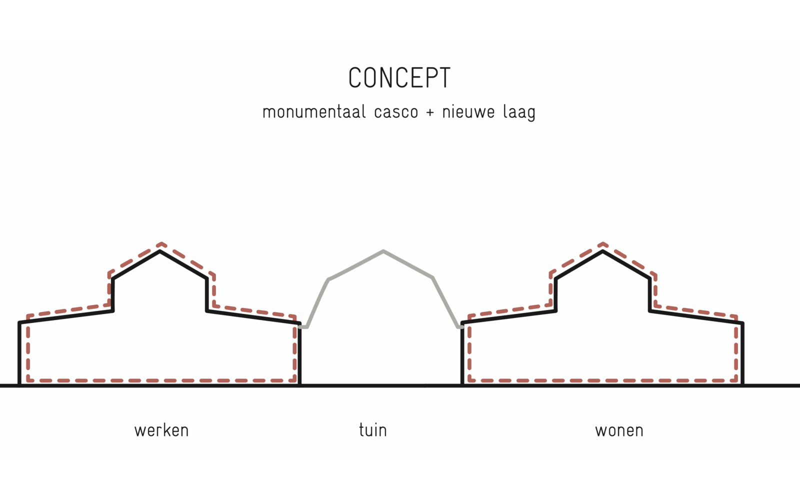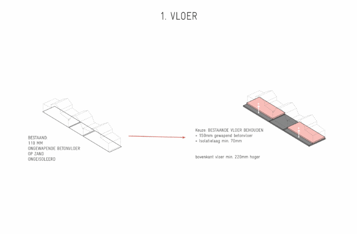 Certain elements, like the window frames, had to be replaced, but even in these cases, the replacements are designed to possess their own aesthetic, strength, and modernity. This showcases a new, distinguishable layer with its own identity, while remaining subservient to the building as a whole. Not immediately apparent from the exterior, is the fact that the building originally consisted of three separate workshops. It isn’t readily visible that behind one façade, there were several distinct spaces, which will soon be converted into eight living and working areas. The open space will feature new bio-based interior structures, with an eye for acoustics and details. The new interior walls are designed to maintain the symmetry and rhythm of the building’s openings, ensuring the original structure to remain discernible. The central hall will be transformed into an open patio, preserving the original framework. This collective central outdoor space will both separate and connect the living area in one side building with the work area on the opposite side.