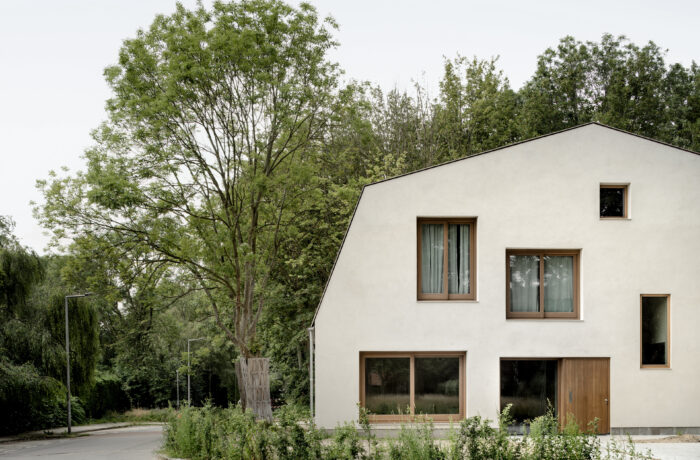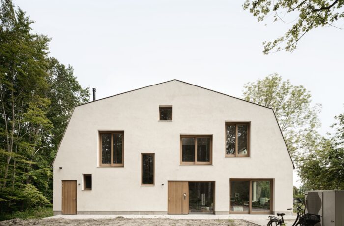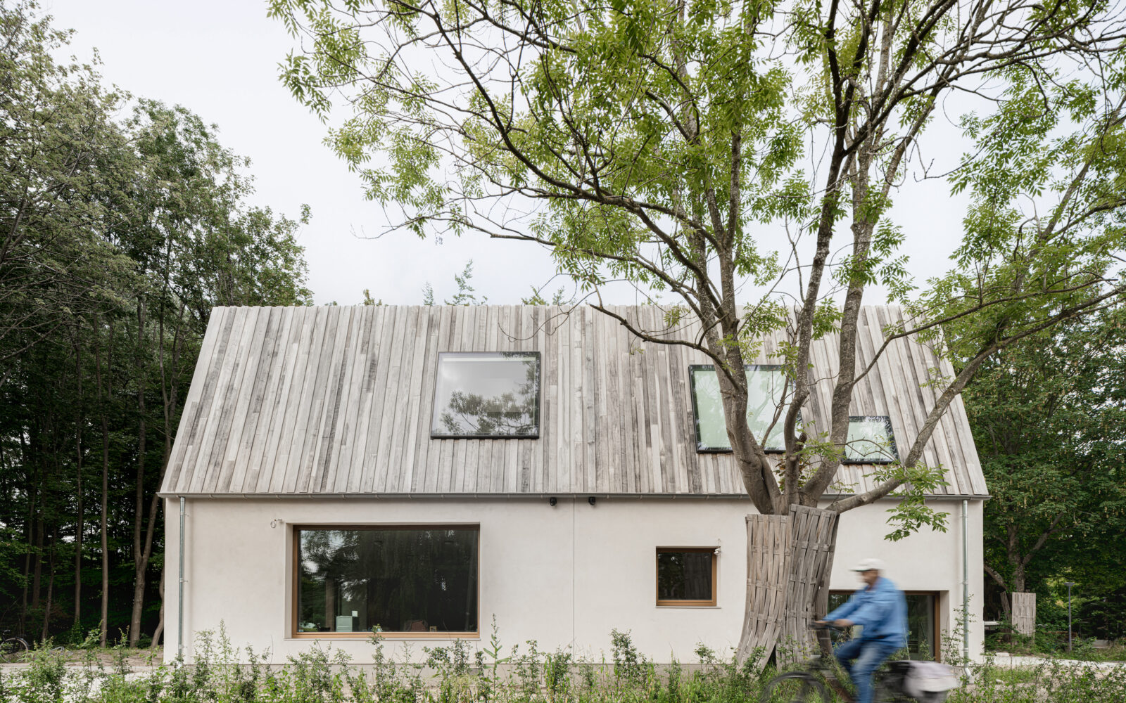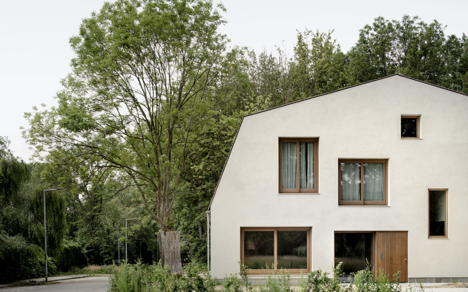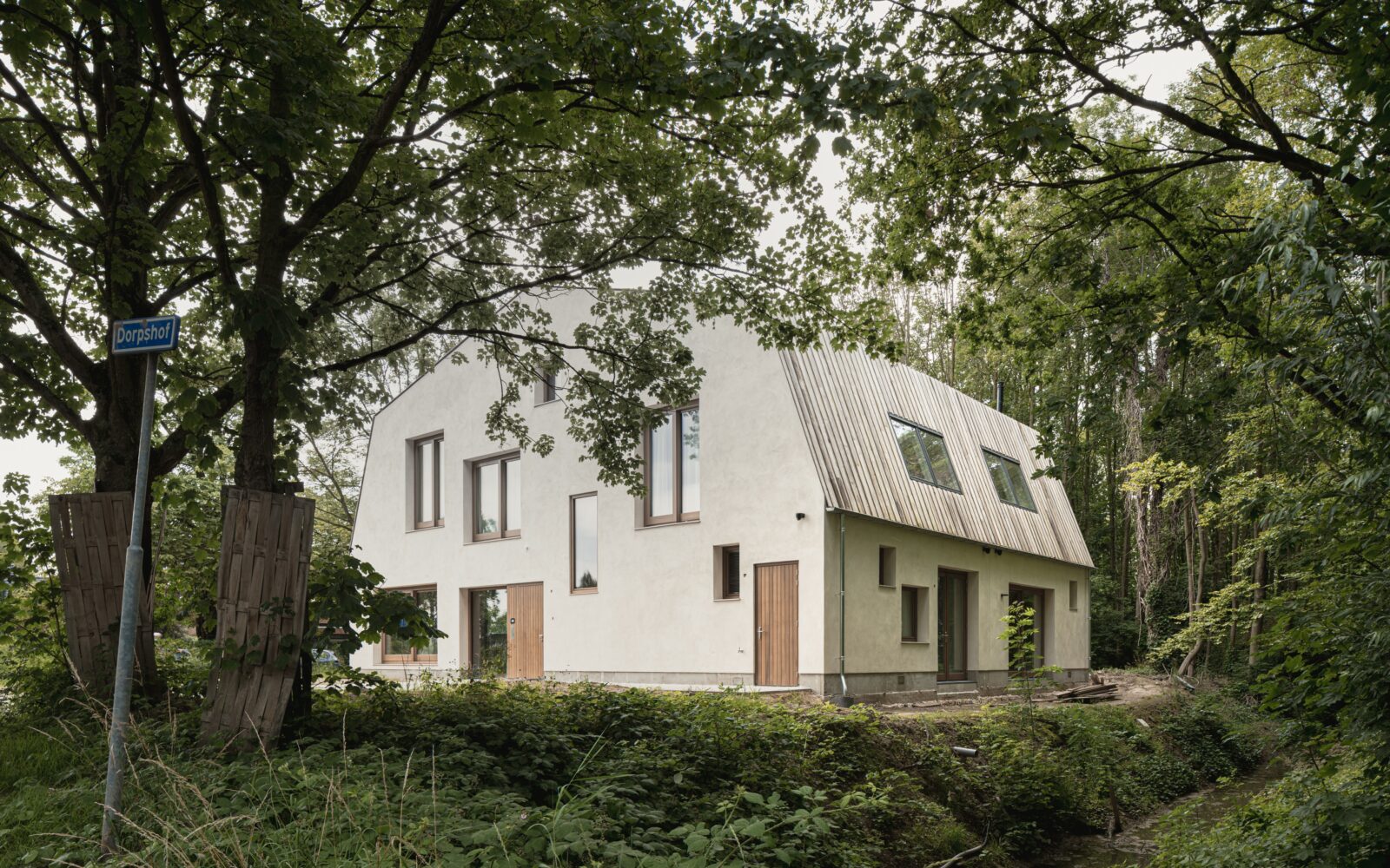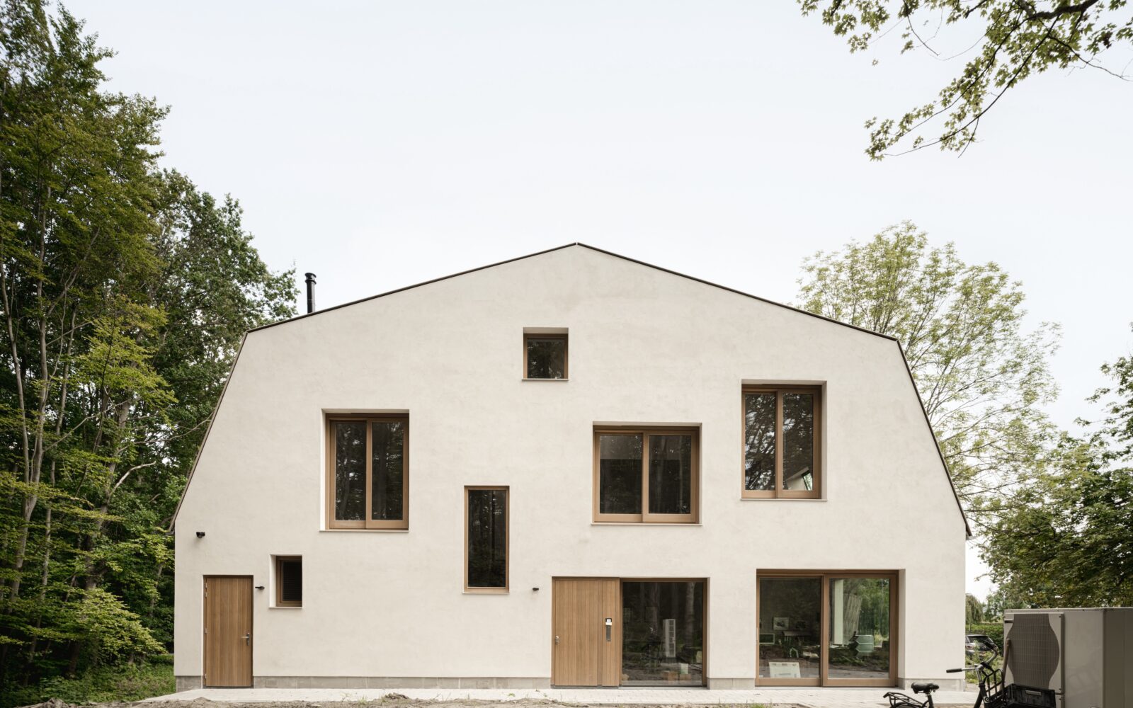 Front view of biobased artist residence with lime-hemp facade and limstone plaster finish by bureau SLA, Rotterdam, 2022