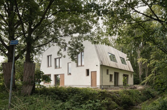 Besides living up to the sustainability goal, the design of this unique dwelling originated from the need of artists, who temporarily remain in the city. You see, the artist residency is not only a place which provides a basic need for humans and how they live in general, we have aimed to design a high quality space for those with a need to create, collectively. The house consists of two mirrored residences, rotated 90 degrees relative to the facade. Therefore, the ground floor exists of a large communal space in the front of each home, designed in such a way that is offers the opportunity to rehearse and even host small plays. At the back of each home, a living room with kitchen is situated, which also functions as a working space, overlooking the beautiful nature surrounding the house. To offer each individual privacy as well, there are three spacious bedrooms per residence, each with an individual bathroom and mezzanine bed. The interior is finished off with a clay plaster. The combination of the used materials for the finishing of the walls – hemp, limestone plaster and clay plaster – creates a vapor open, indoor climate. This regulates the temperature and ventilation in such a way that there is little need for the use of any additional installations.