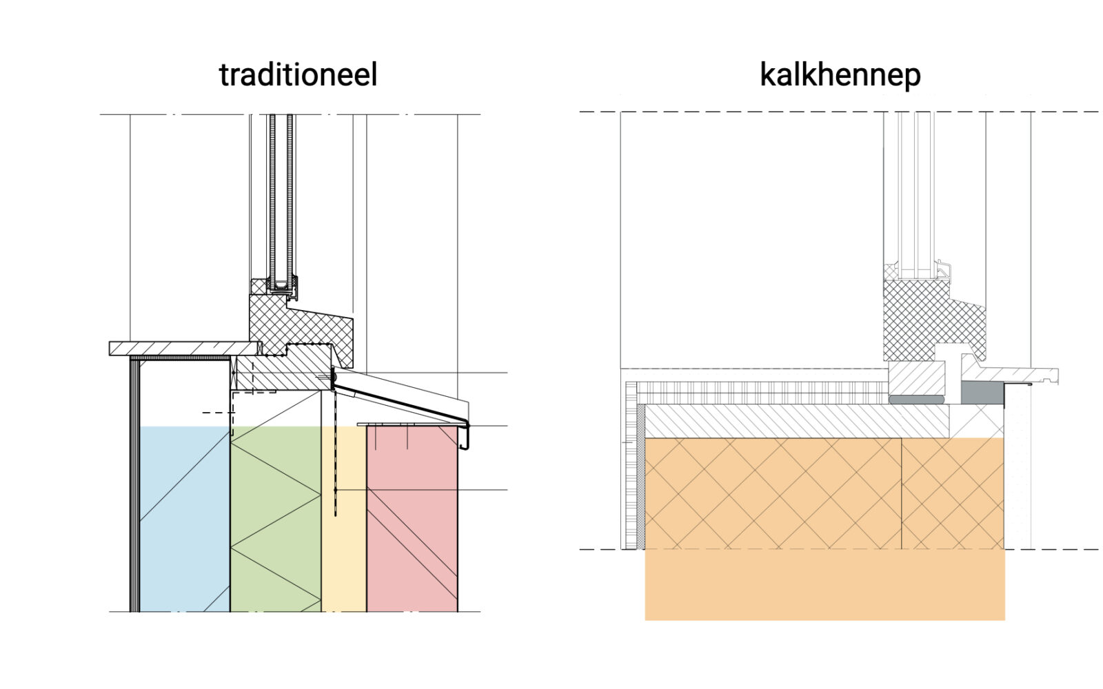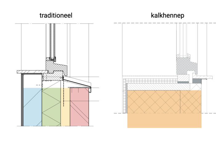To succeed in our mission, the load bearing walls and solid elements of the building are constructed from a prefab lime-hemp system. The hemp-concrete shell can be disassembled and is a 100% natural product. Using hemp creates a solid facade, a method reminicent of traditional building techniques, fitting with the traditional typology of the building. The facade is part of the supporting structure, instead of just functioning as an empty shell. The strength of the solid hemp is emphasised in the design even more by the sleek details, the limestone plaster finish and the large openings in the facade which serve as window frames. This causes a dynamic depth effect, highlighting the openings in the facade, which are positioned in a playful composition, hinting to the creative residents.