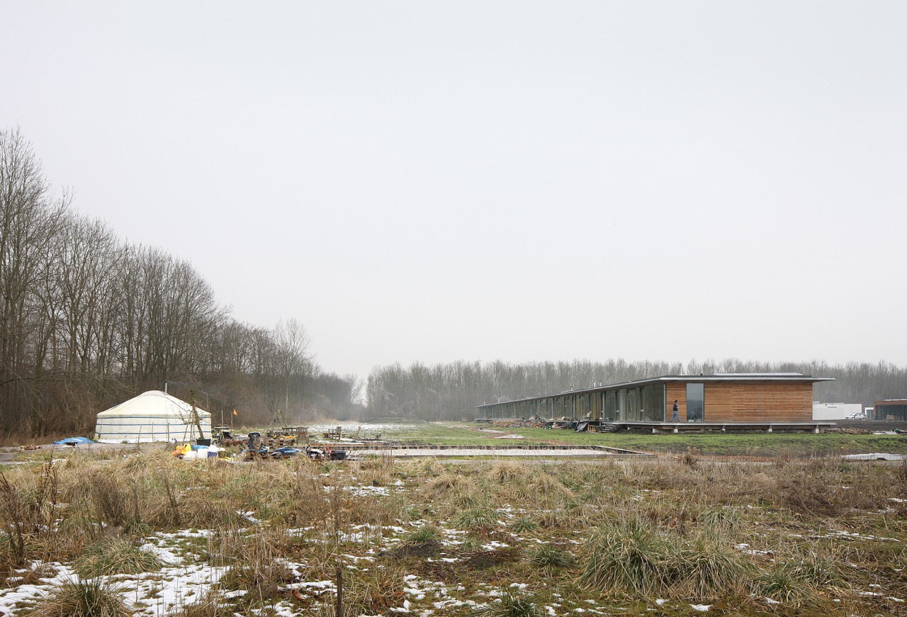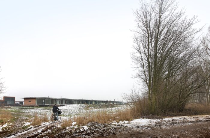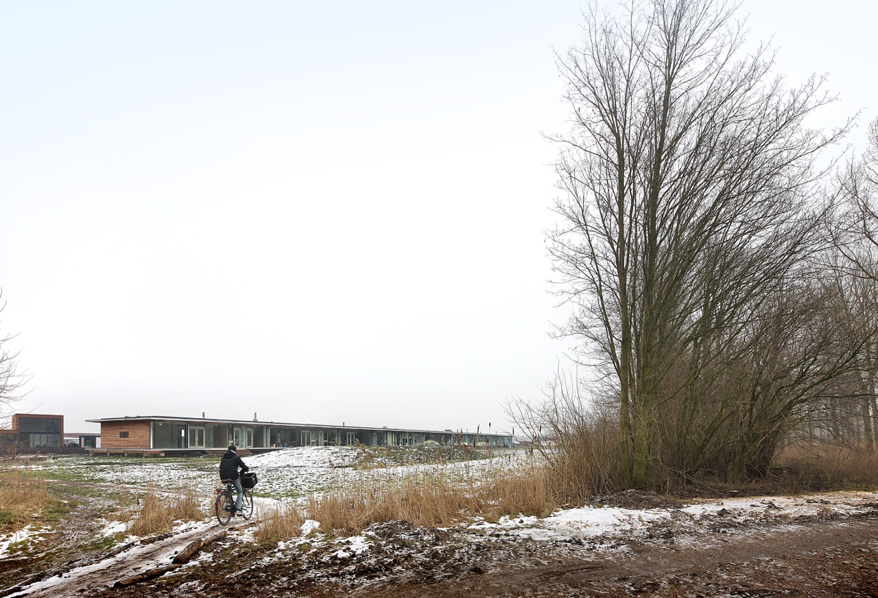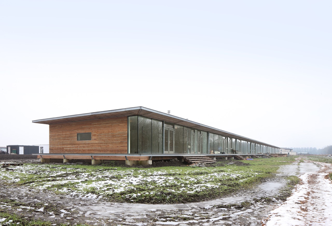 The design by bureau SLA and ZakenMaker of nine terraced houses for the self-sufficient community ‘Bosveld’ at the end of the Emile Durkheimweg, was the first building to be realized in this polder. The concept has now been built three times at different locations in Almere Oosterwold. Bosveld is a small community in a 100 meter long building, on a spacious plot of 11,000 m2. The agricultural character of the landscape has been preserved, and the residents grow vegetables and fruit on their land. The wastewater is purified in a helophyte filter and energy is generated by a heat pump and solar panels. The building makes optimal use of the south-facing sun, so that little heating is required in winter. The nine single-storey homes vary in size from 120 to 160 m2 and are raised one meter above ground level, which creates a floating effect. The residents have an elevated view over their shared landscape garden and the surrounding woods.