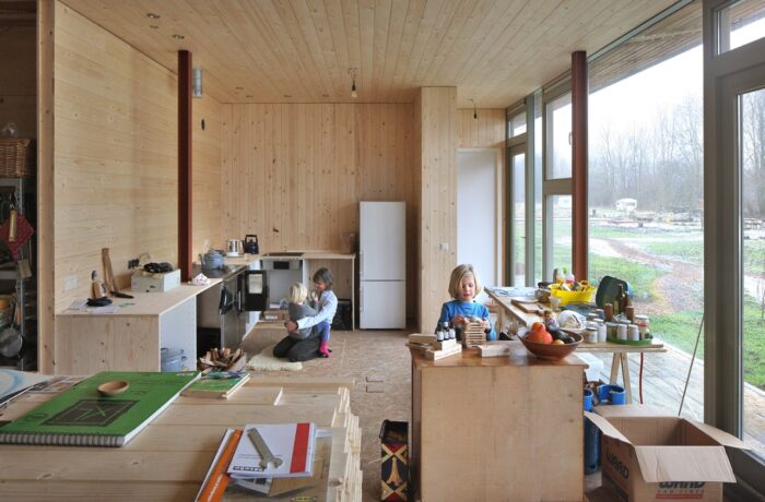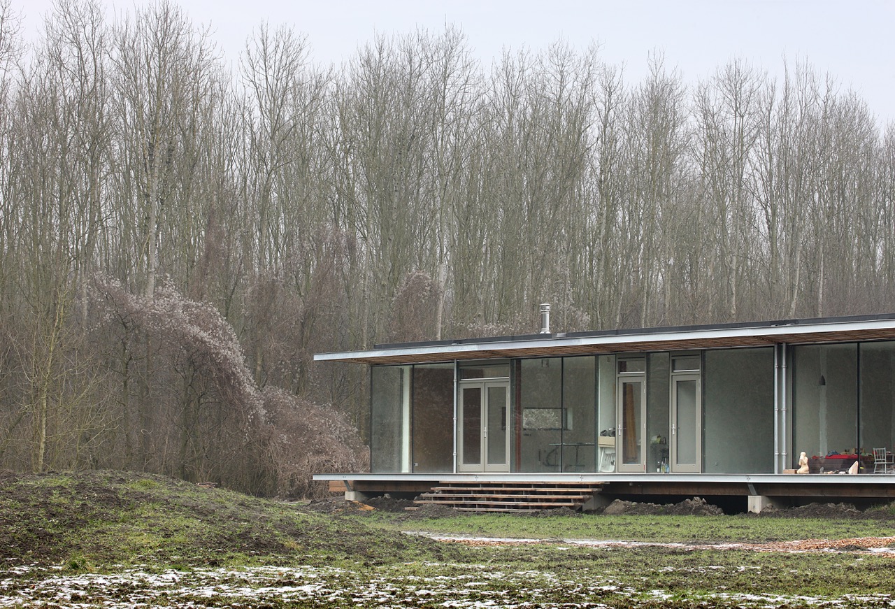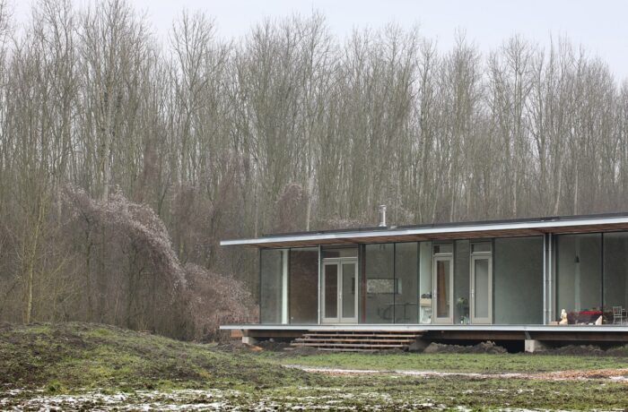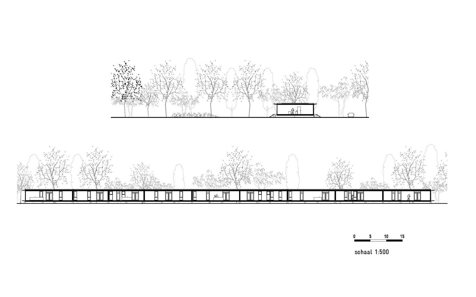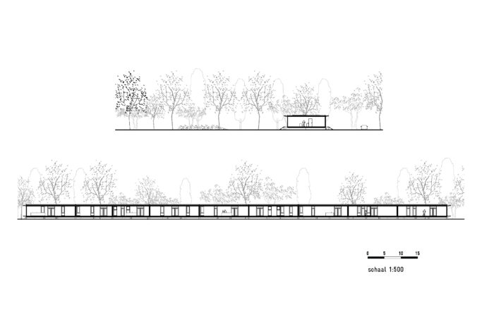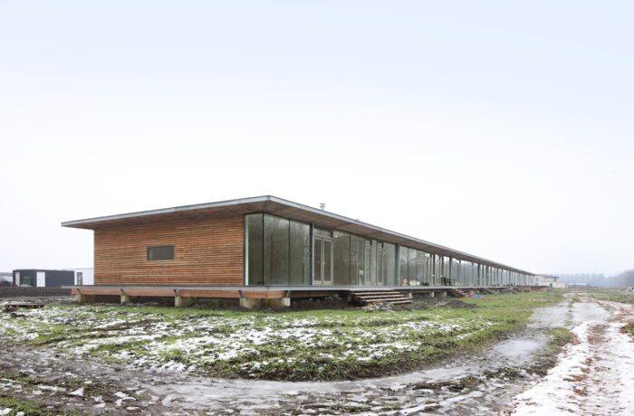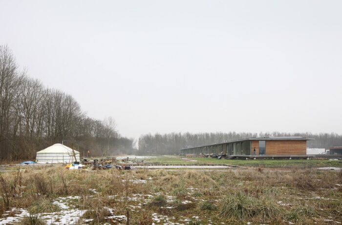 The design by bureau SLA and ZakenMaker of nine terraced houses for the self-sufficient community ‘Bosveld’ at the end of the Emile Durkheimweg, was the first building to be realized in this polder. The concept has now been built three times at different locations in Almere Oosterwold. Bosveld is a small community in a 100 meter long building, on a spacious plot of 11,000 m2. The agricultural character of the landscape has been preserved, and the residents grow vegetables and fruit on their land. The wastewater is purified in a helophyte filter and energy is generated by a heat pump and solar panels. The building makes optimal use of the south-facing sun, so that little heating is required in winter. The nine single-storey homes vary in size from 120 to 160 m2 and are raised one meter above ground level, which creates a floating effect. The residents have an elevated view over their shared landscape garden and the surrounding woods.