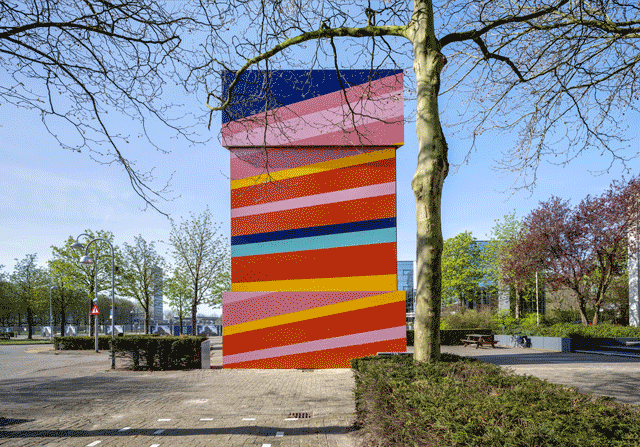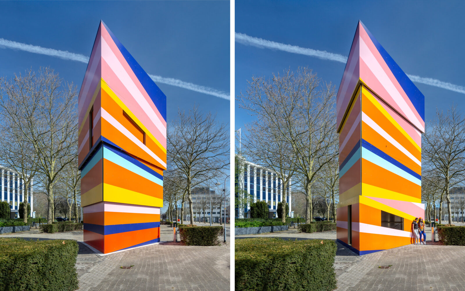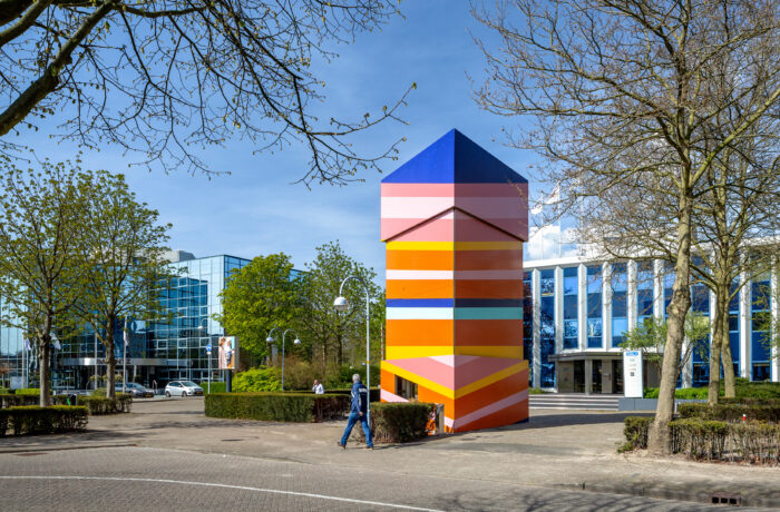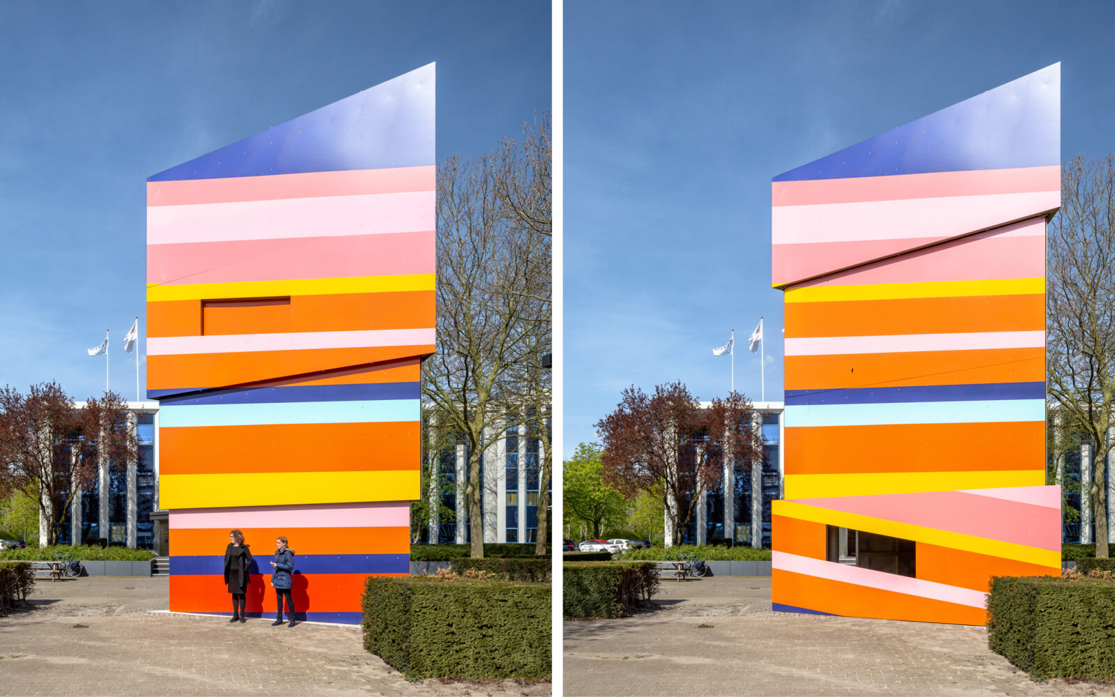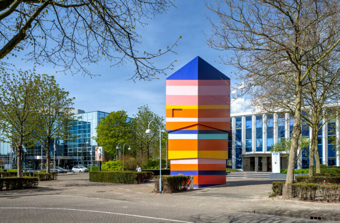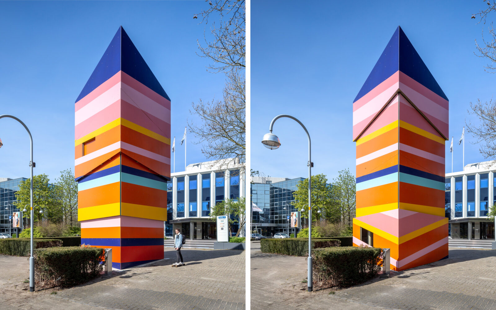 The moving, colorful folly adds a cheerful addition to Kometenplein (literally: Comets-Square, but also: ComeEatSquare), next to Hoofddorp railway station. It anchors outdoor gatherings. Food trucks pull up, people meet for drinks after work, and small events take shape around the 10-meter-high object.