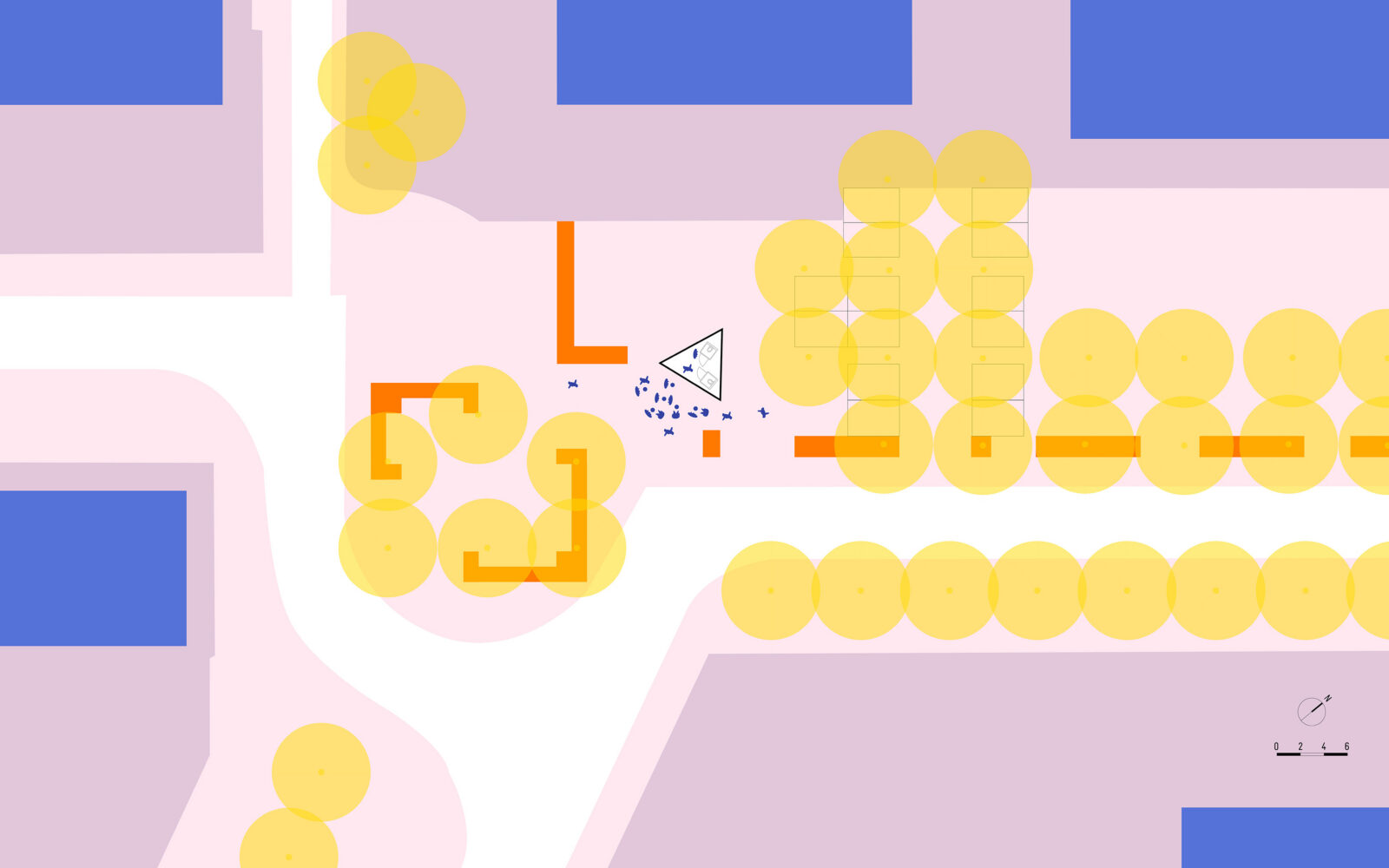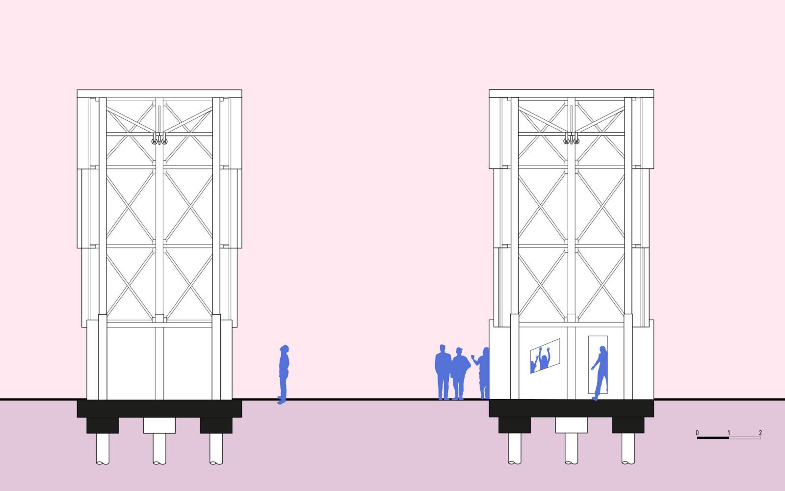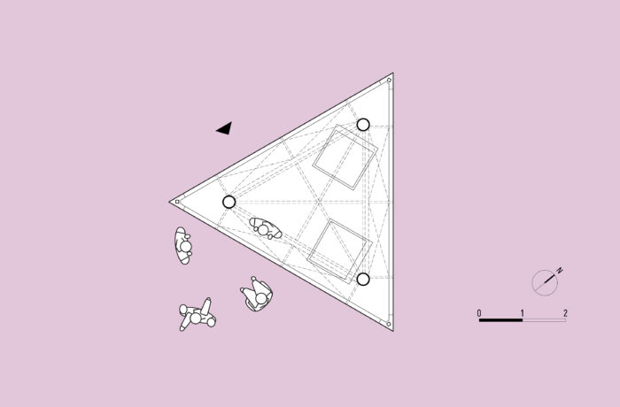 The triangular pavilion consists of four segments. Two segments can move vertically and swap positions. The pavilion opens and closes through this movement. When closed, the door and serving hatch are located 6 meters above ground level; after the switch, they open directly onto the square.