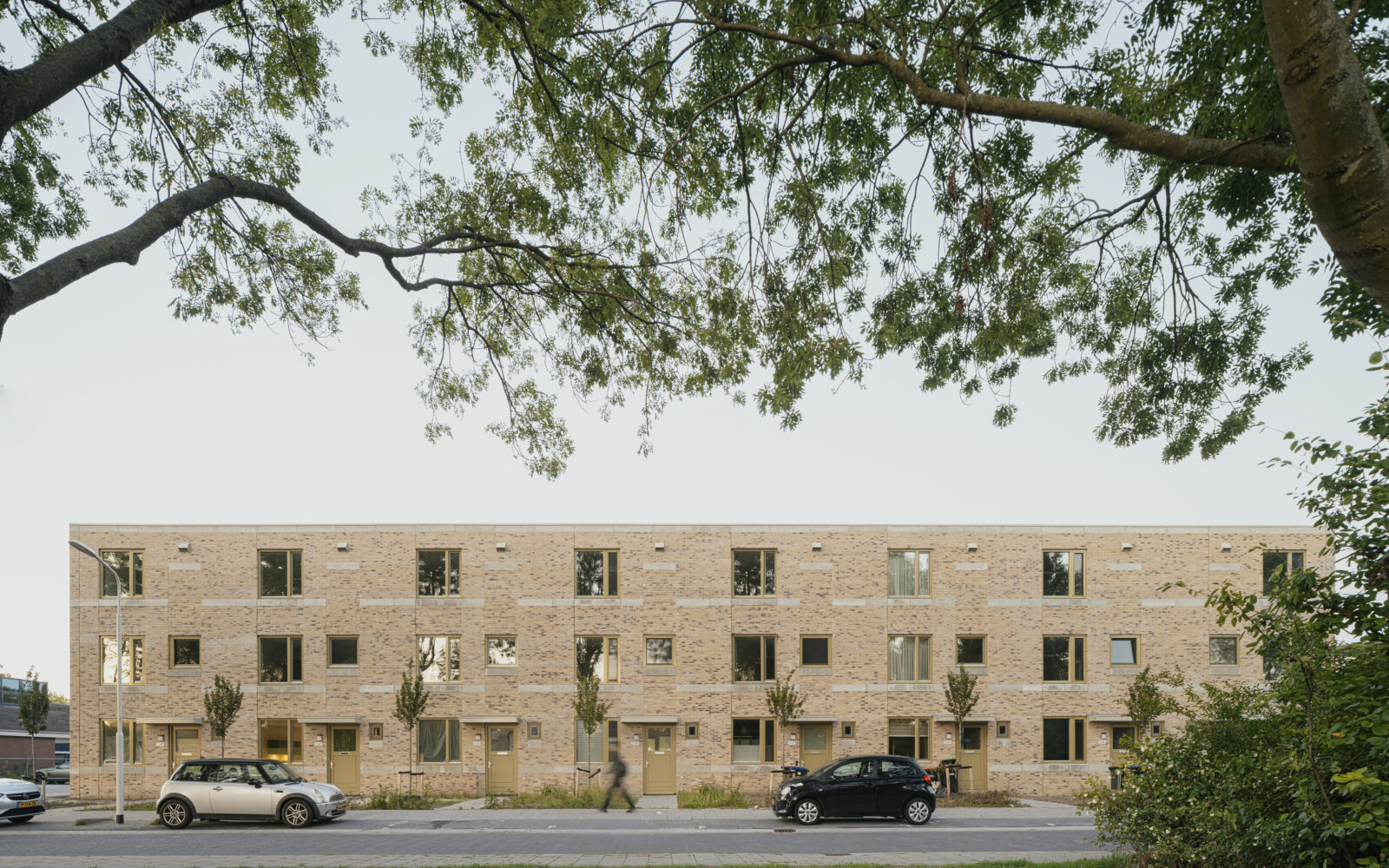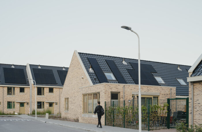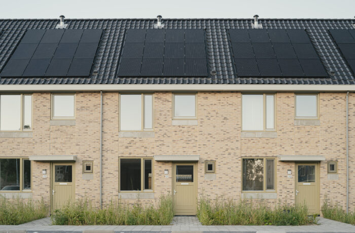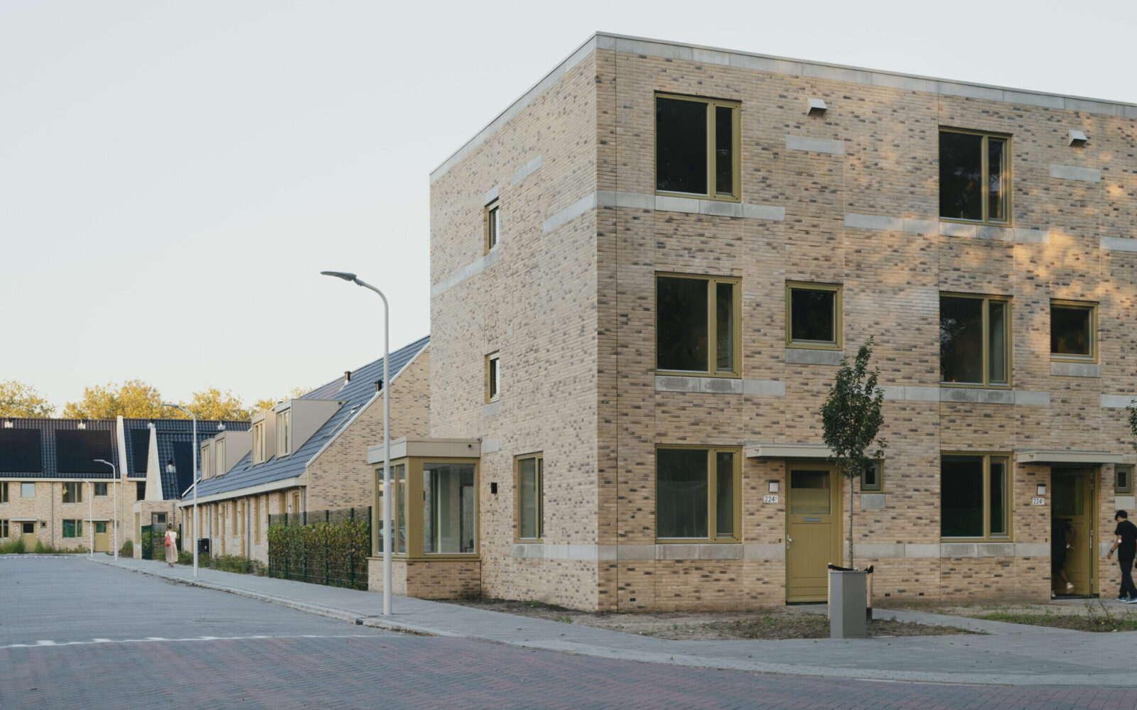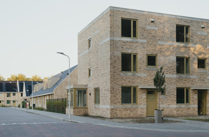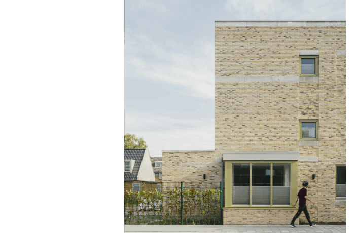 Het Pauwenhof consists of three distinct types of homes to address the unique needs of diverse residents: For senior residents, one and a half floor homes with a ground-floor bedroom surround a communal courtyard. For singles or couples without children we have designed two and a half story residences, while the larger family homes, spanning three floors, are connected to a lush green park featuring a playground. Despite catering to different resident needs, we have maintained a cohesive aesthetic through shared architectural details. The brick facades are carefully designed with a high quality brick in two different masonry bonds. The chosen architectural detail connects different buildings by applying the same concrete bands on the facades, creating a unified visual identity.