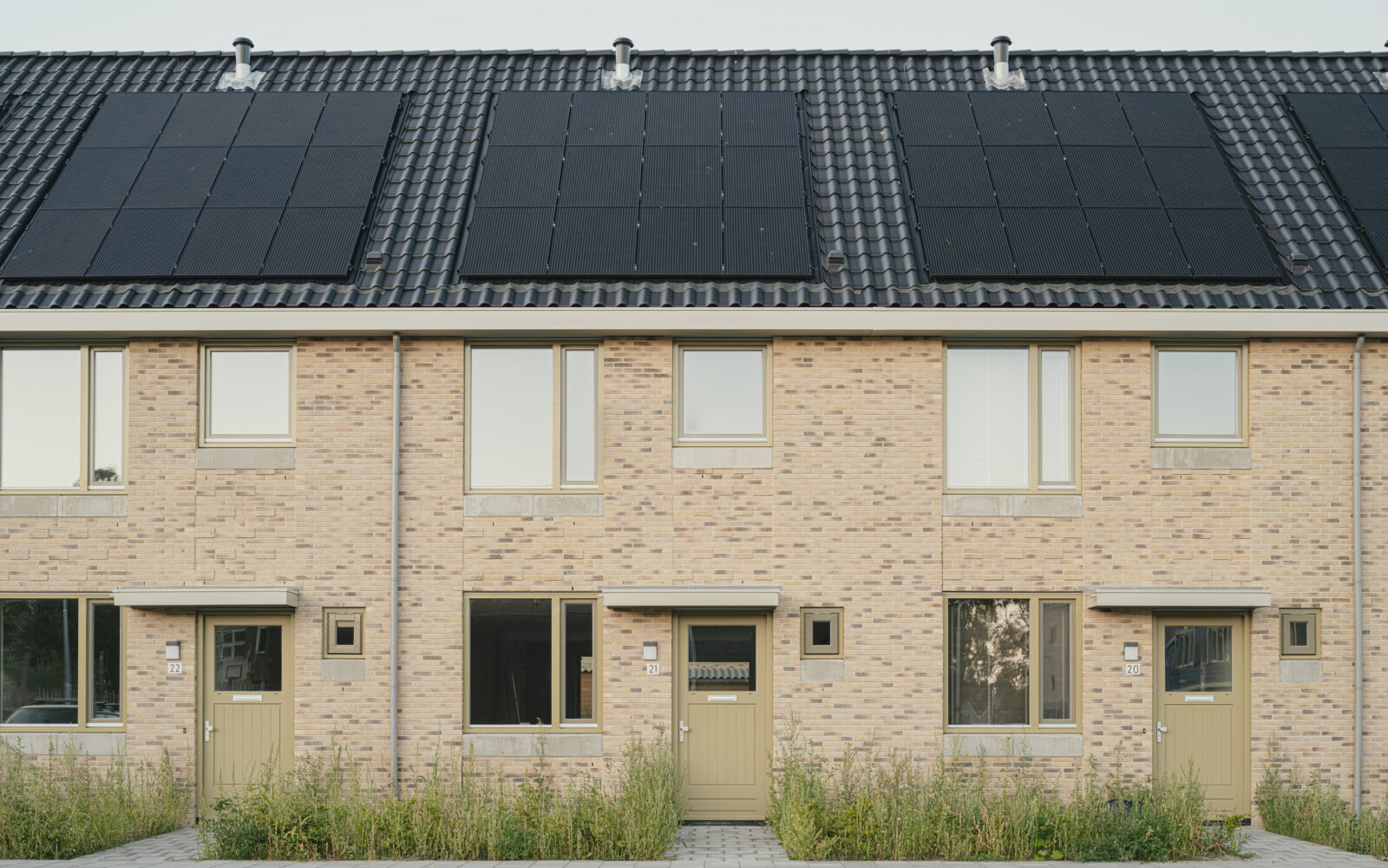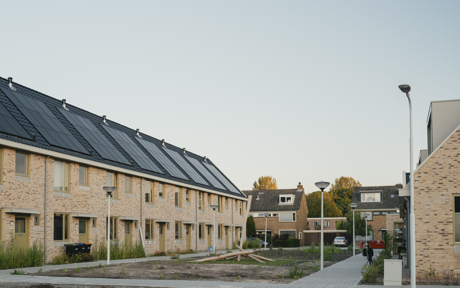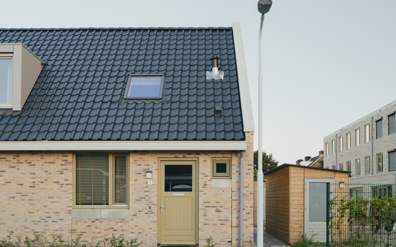 Het Pauwenhof consists of three distinct types of homes to address the unique needs of diverse residents: For senior residents, one and a half floor homes with a ground-floor bedroom surround a communal courtyard. For singles or couples without children we have designed two and a half story residences, while the larger family homes, spanning three floors, are connected to a lush green park featuring a playground. Despite catering to different resident needs, we have maintained a cohesive aesthetic through shared architectural details. The brick facades are carefully designed with a high quality brick in two different masonry bonds. The chosen architectural detail connects different buildings by applying the same concrete bands on the facades, creating a unified visual identity.