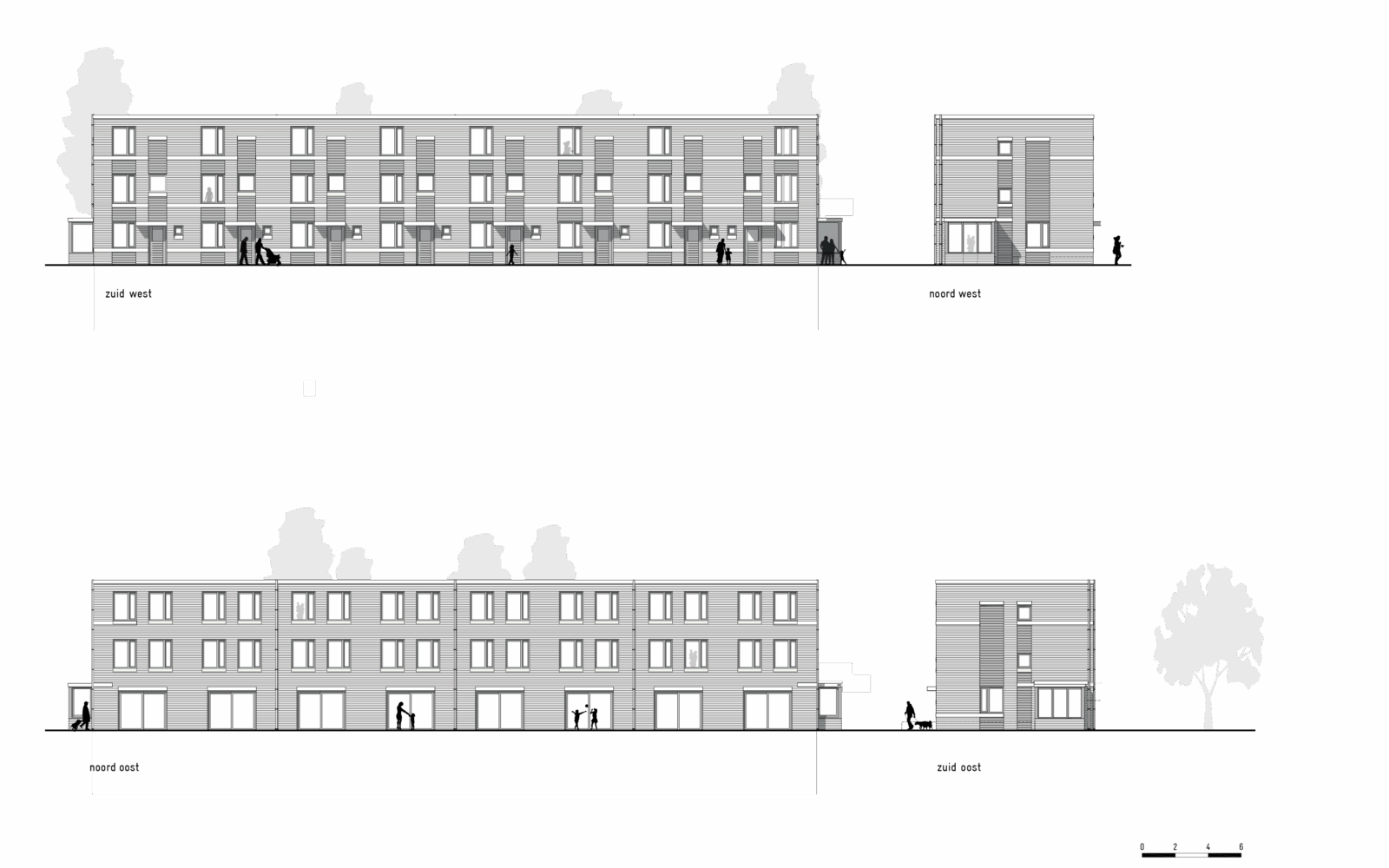 Pauwenven, a beautiful area in Zaandam which previously functioned as an educational district, has been redeveloped into a zone for land-bound living. Since a key requirement is to sustain the recognisable green character of the neighbourhood, we have kicked-off the design with a courtyard-typology. It’s a typology we have enjoyed researching and experimenting with in the past. This time we have reinvented the typology to suit the needs of a mixed audience. Our goal? To create a living environment which is enjoyable for inhabitants of various ages and household sizes. The result? Het Pauwenhof, consisting of 29 family residences in two sizes and 14 senior homes.