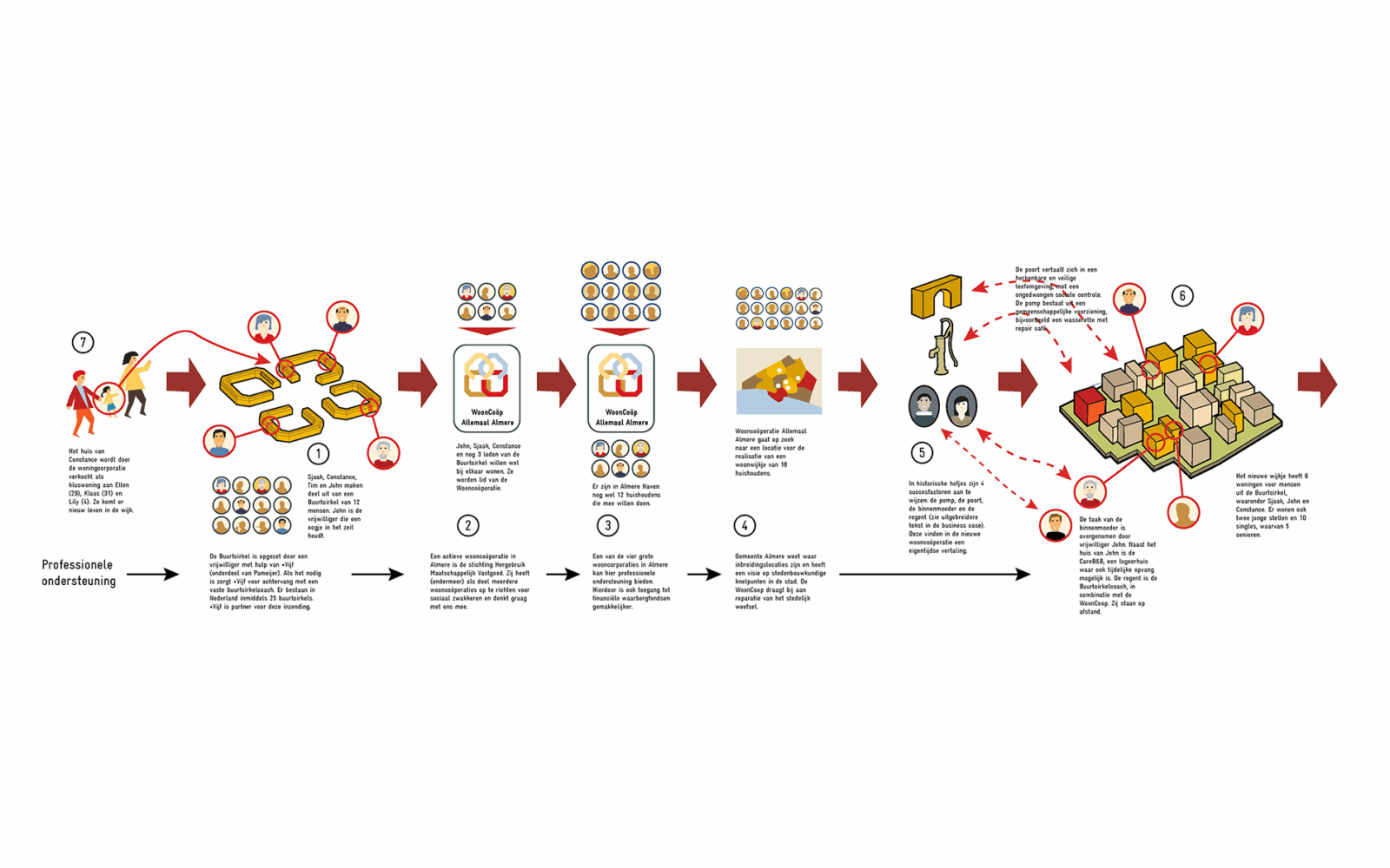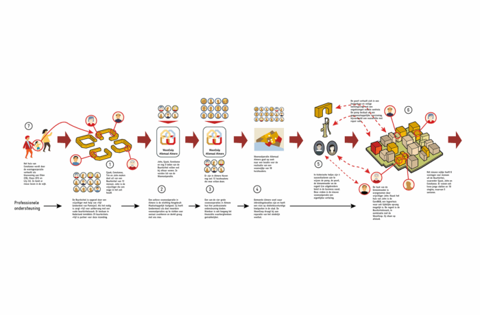 Both initiatives work on an inclusive city and find each other in this project. In the neighborhood circle, the volunteer receives support from a housing-coach who helps with issues that residents can not (yet) arrange alone. This organizational model is in line with that of the historical courtyards. The residents coach is the regent, the volunteer can be seen as the courtyards mother. The base for the connection between the residents are the common values. But Burenbond differs from the former courtyards in which age, and not interests, connected the individuals.
